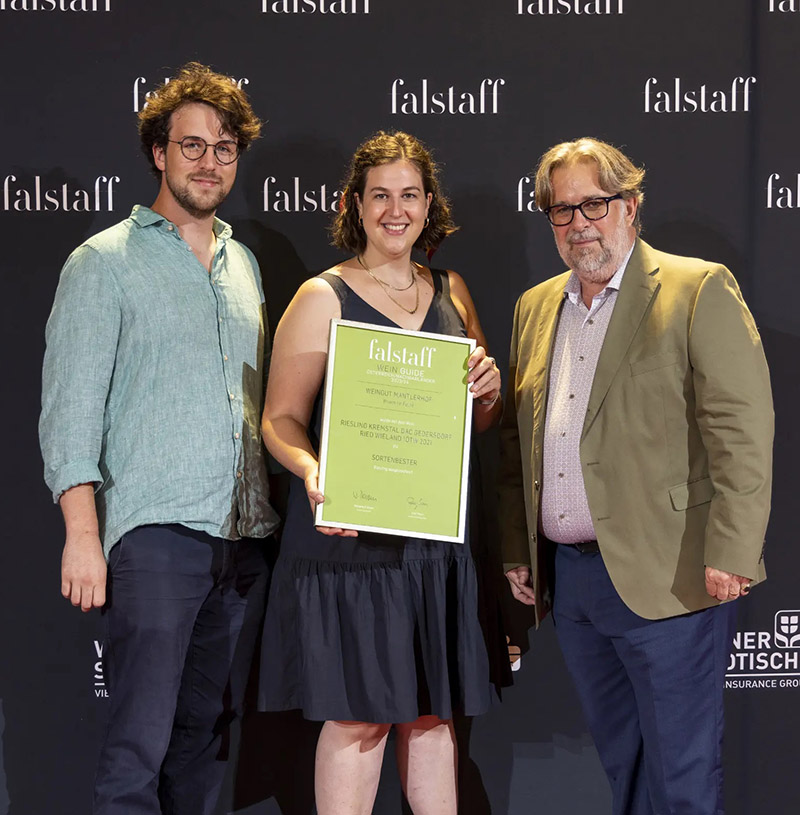 Vergangenen Montag, dem 13. Juli 2023 wurde in der Wiener Hofburg der neue Falstaff Weißweinguide im Rahmen der Weißweingala präsentiert. Der Falstaff Guide ist der wichtigste Weinführer in Österreich, wenn nicht sogar im ganzen deutschsprachigen Raum. Zu unserer eigenen, sehr positiven Überraschung wurde unser aktuelles Sortiment mit großartigen Wertungen belohnt. Das kein Wein mit weniger als 92 Punkten bewertet wurde ist Zeugnis dafür, wieviel Energie und Aufmerksamkeit wir auch in die „kleinen“ Gewächse stecken. Gerade der Einstieg sagt viel über einen Betrieb aus. Besonderes erfreulich sind dennoch die Bewertungen für unsere Erste Lagen. Hier brachte uns der Riesling Ried Wieland 1ötw 2021 die sagenhafte Bewertung von vollen 100 Punkten nach Hause. Diese Top Wertung wurde in Österreich insgesamt erst ein paar mal vergeben und ist im Kremstal überhaupt eine Premiere für einen aktuellen Jahrgang (wir bekamen letztes Jahr für einen Gelben Muskateller aus 1951 ebenfalls diese Top Wertung, damit gibt es insgesamt nur 2 Weine aus dem Kremstal die so hoch bewertet wurden). Gemeinsam zu dieser Wertung wurde er auch als „Sortenbester“ Riesling des Landes auserkoren. Ex Aequo mit den Kollegen Hirtzberger, FX Pichler, Knoll und Hirsch. Wir freuen uns hier also über allerbeste Gesellschaft! Es freut uns immens dass diese Lage und dieser Wein in den Olymp der absoluten Top Gewächse Österreichs, wenn nicht sogar der Welt aufsteigen darf. Die Ried Wieland wird bei uns schon über 100 Jahre gepflegt und war immer einer der Ecksteine unseres Sortiments, gemeinsam mit der Ried Spiegel der Nucleus unseres Betriebs. Grüner Veltliner Ried Spiegel 1ötw 2021 sowie Riesling Ried Steingraben 1ötw 2021 können sich über grandiose 96 Punkte freuen. Wir möchten uns bei allen bedanken die an diesen Weinen mitgewirkt haben, allen voran unsere langjährigen Mitarbeiter Anneliese, Benedikt, Sabine und Isni. Alles in allem können wir uns nur freuen und sehen diese Bewertungen als Bestätigung unserer Arbeit und als Ansporn in der Zukunft die Qualität noch weiter zu steigen. „Hurra!“ – Familie Mantler