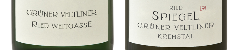 Wesentliche Informationen sind die Sorte, die Herkunft und bei edelsüßen Weinen das Prädikat. Hier ist eine subtile Botschaft versteckt: bei Weinen bei denen die Lage im Vordergrund steht und den Wein mehr prägt als die Sorte, ist der Riedenname größer geschrieben – sonst die Rebsorte. Also: Ried SPIEGEL Grüner Veltliner, GRÜNER VELTLINER Ried Weitgasse. Als Herkunft finden sie die Einzellage, die Gemeinde oder das Weinbaugebiet. Übrigens wurde der Zusatz Ried verpflichtend eingeführt um die Einzellagen von ähnlich klingenden Markenbezeichnungen klar zu unterscheiden.
